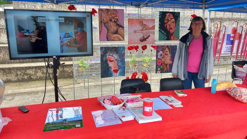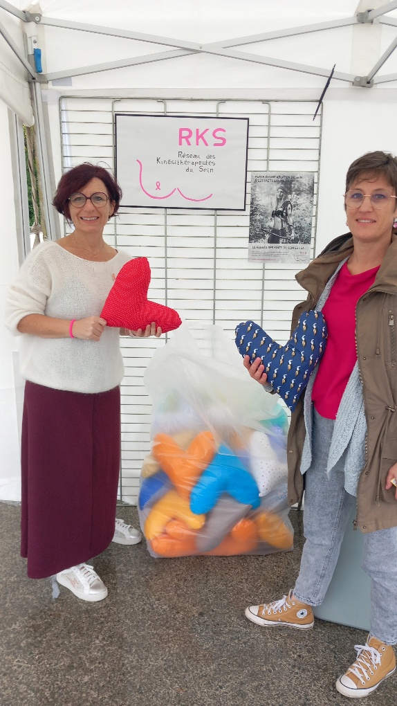 Nous avons eu des visites au stand, des (anciennes) patientes, des exposants, et des admirateurs des toiles d’Aurélie Boune, qui a redécouvert la peinture lors de son traitement et de ses séances d’Art-thérapie avec Olivia. Un grand bravo :). Ces toiles seront exposées dans le service de radiothérapie du CERAC (au CHA) pendant le mois d’Octobre. Nous avons remis des coussins coeur au RKS (réseau des kinés du Sein)