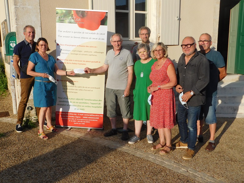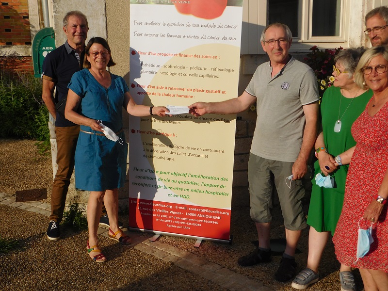 Le jeudi 29 juillet, en présence de Ms. Didier VIDEAU , président, Bernard BRIS, trésorier, Mmes Sylvie BRIS, maire-adjoint, Brigitte FOURÉ, maire déléguée de Villejésus et conseillère départementale, M. Guillaume QUENAUD, chargé de mission Santé, Sport, Solidarité du Pays Ruffecois, et Serge VAN KACHE, membre de l’association, un chèque de 362 € à été remis à Françoise CAPDEVIELLE et Jean-Louis ANDREAU, présidente et vice-président de Fleur d’Isa.