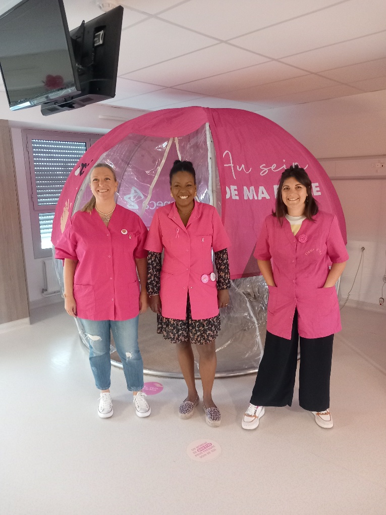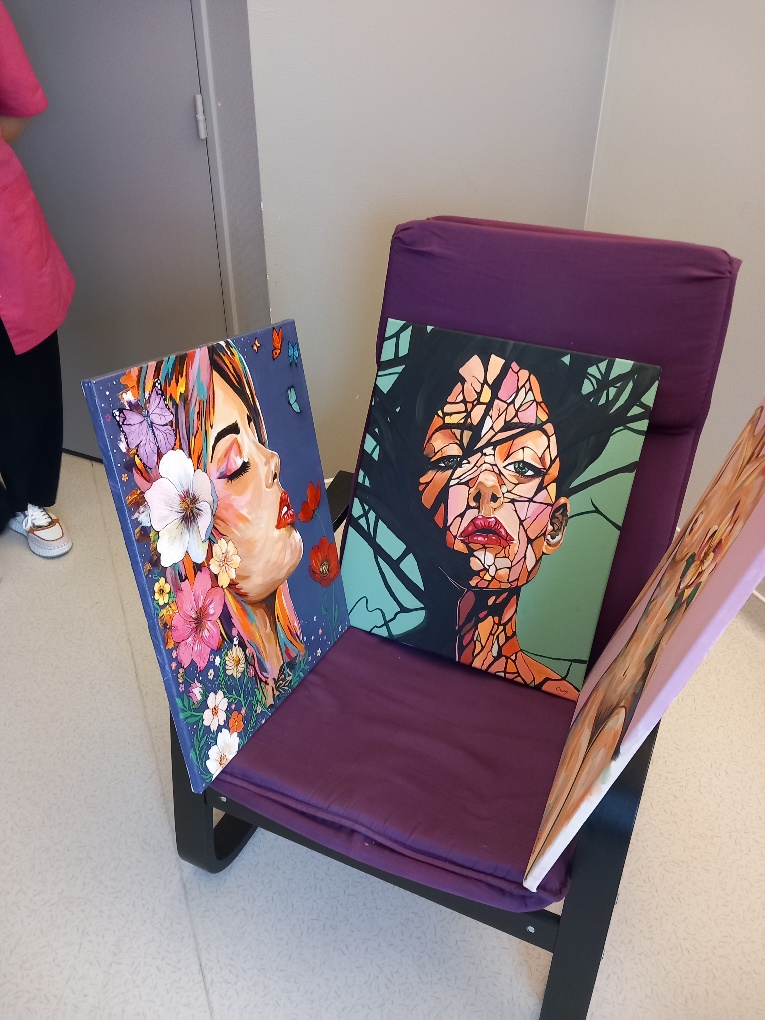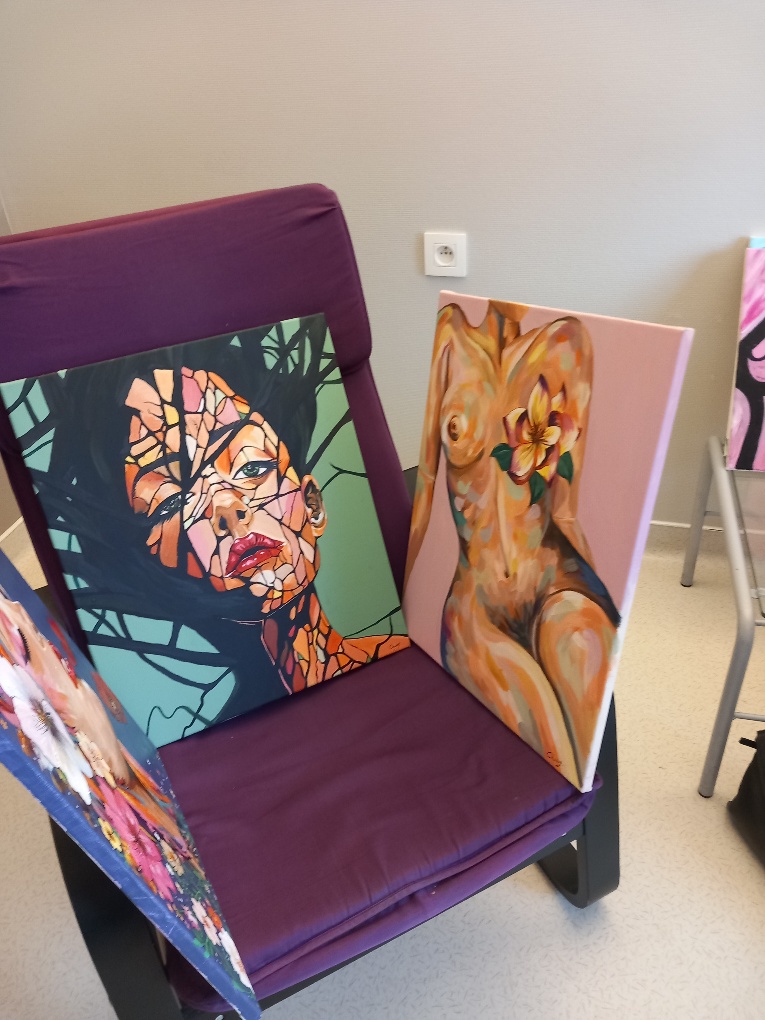 Aurélie Boune (ancienne patiente) présente ses œuvres sur le thème du corps de la femme. 5 de ses tableaux seront exposés aux Bulles Roses (le 4 Octobre) sur le stand de Fleur d’Isa, puis ensuite dans le service de radiothérapie au CHA, pendant le reste du mois.