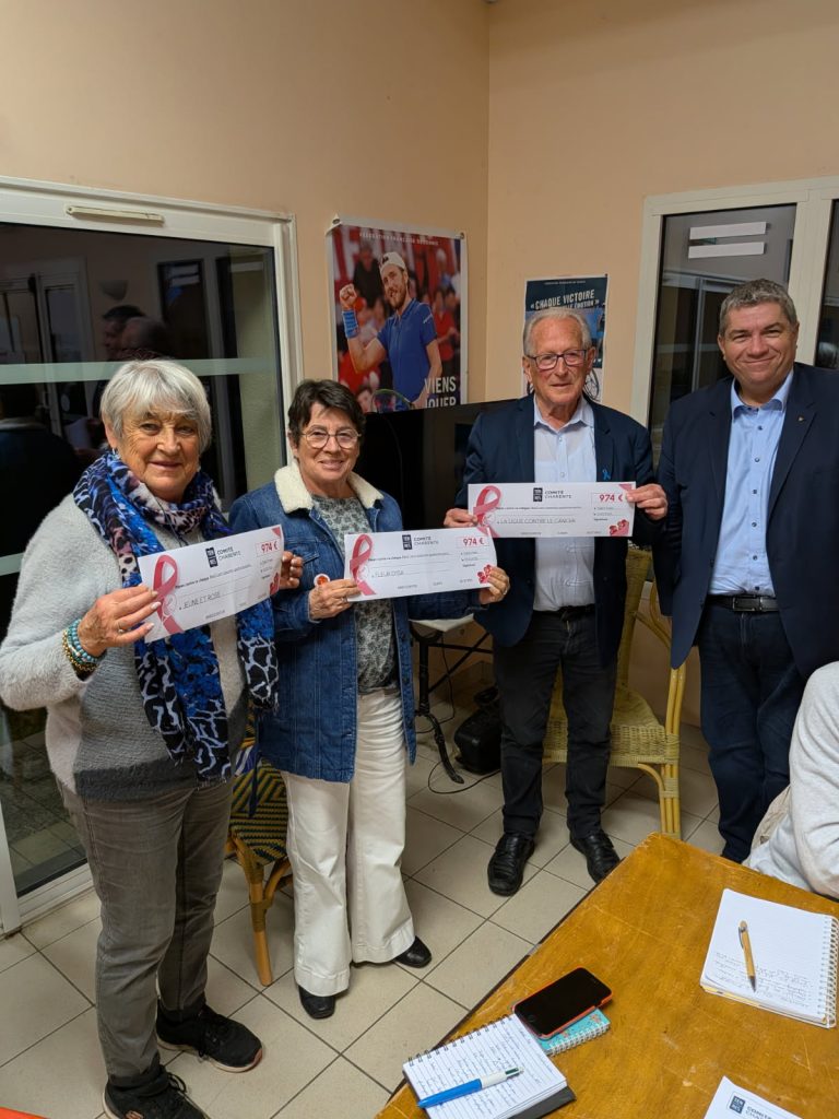 Le Président, Cyril BERLAND et la dynamique Bernadette TOUSSAINT-FEIX, instigatrice de la manifestation, on remis les chèques de 974 € à Fleur d’Isa, Jeune et Rose (absentes excusées sur la photo) et la Ligue contre le Cancer.